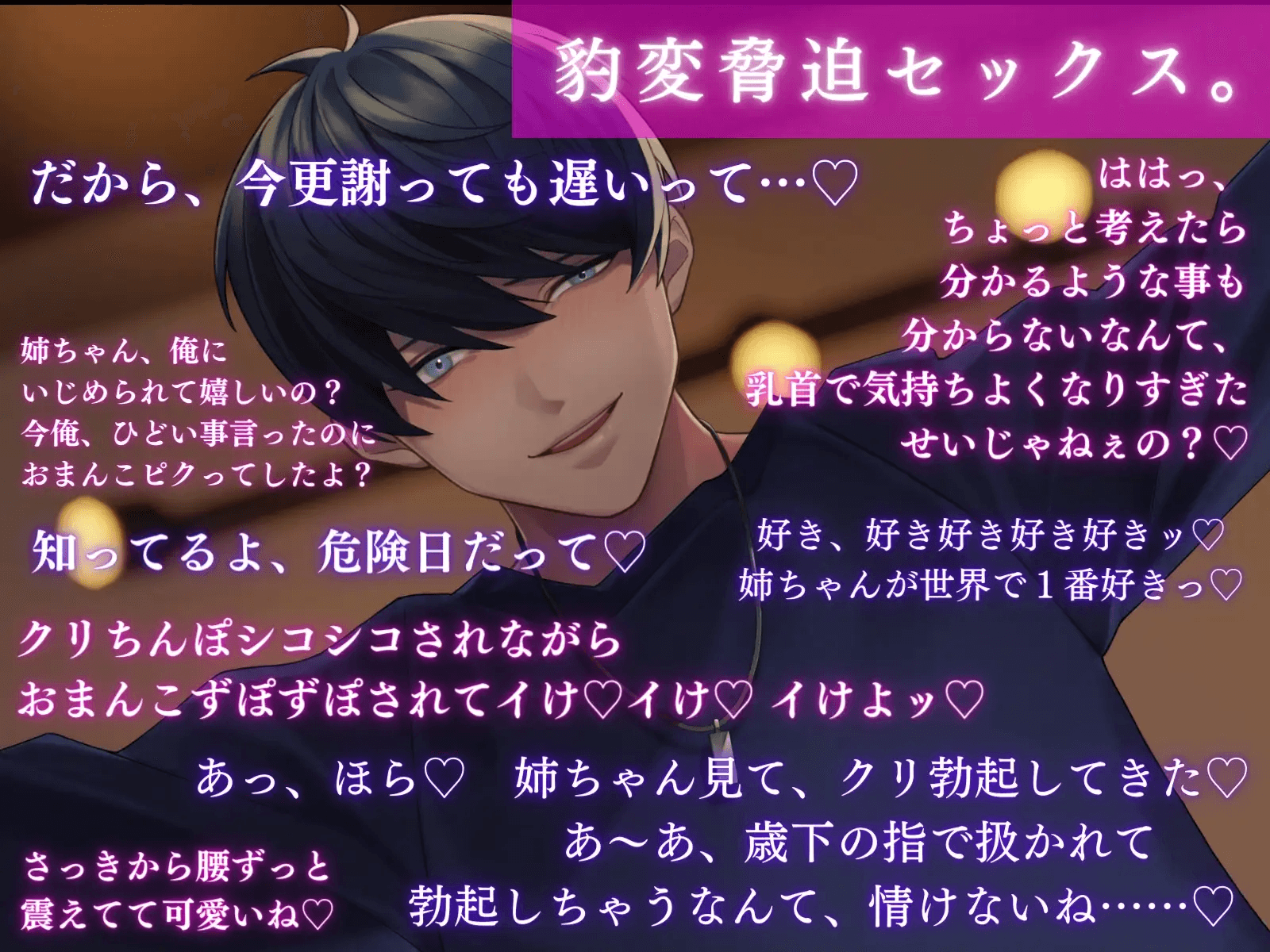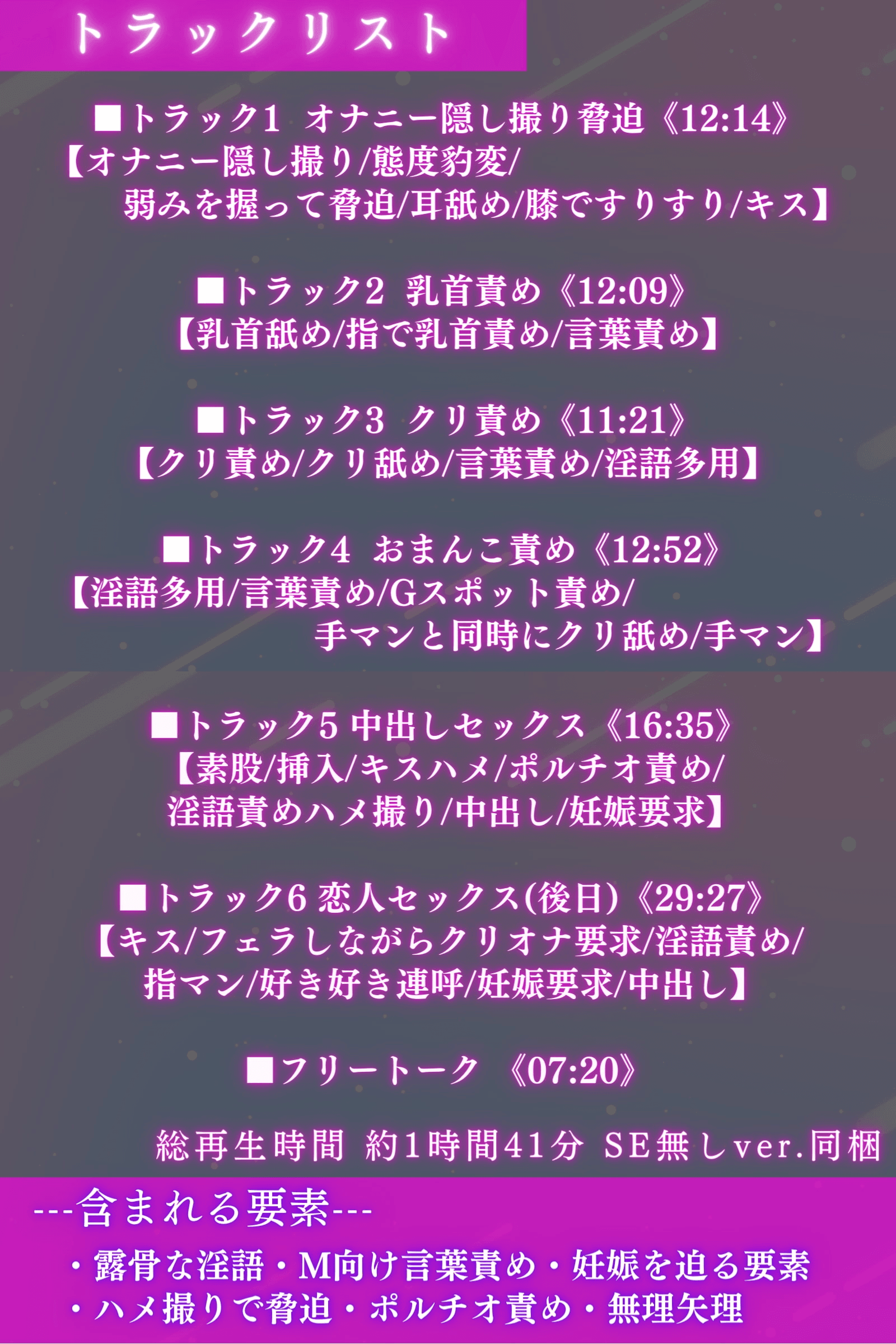 | ジャンル | 淫語 バイノーラル/ダミヘ ヤンデレ 退廃/背徳/インモラル 妊娠/孕ませ 言葉責め 命令/無理矢理 耳舐め |