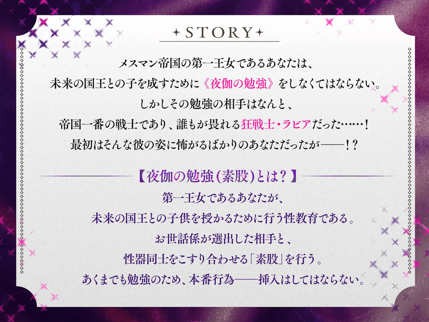 メスマン帝国の第一王女であるあなたは、未来の国王との子を成すために《夜伽の勉強》をしなくてはならない。