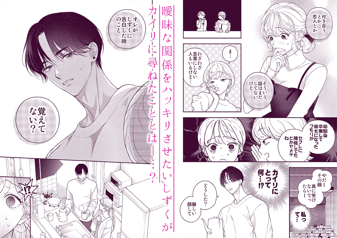 「セフレに降格」なんて言葉に不安を抱くしずくですが、実はカイリがずっと昔から彼女に一途だった事実が発覚!彼女が覚えていない頃の告白エピソードや「おれの彼女に…」と言いながら男友達を牽制するカイリの行動にときめきが止まりません💖 想いが通じ合い、正式な告白から恋人になる瞬間は、読んでいてキュンキュン必至です✨